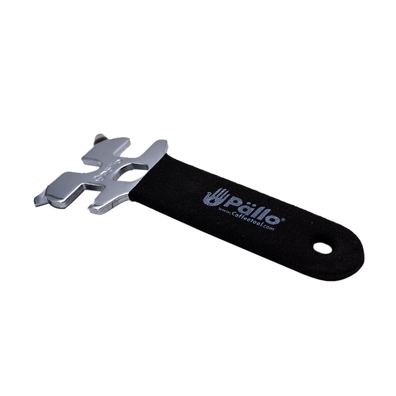 Der Pällo Koffeinschlüssel ist aus langlebigem Edelstahl gefertigt, mit einem schwarzen Gummigriff. Das Werkzeug ist robust, liegt fest und stabil in der Hand. Endlich gibt es ein universelles Multitool für alle Espresso-Wartungsaufgaben: